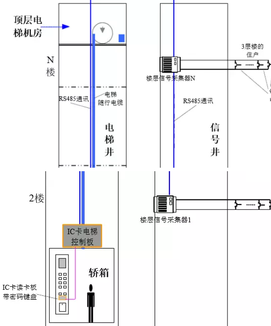 住戶室內開關信號給樓層信號采集器。通常每三層樓安裝1個樓層信號采集器,負責采集三層住戶的按鍵信號,每戶的按鍵均聯線到本樓層信號采集器(如上圖),同時所有樓層采集器采用485方式通過電梯的隨行電纜連接到與轎頂的IC卡電梯控制板,通過各采集器,將住戶室內開關信號傳給IC卡電梯控制板。